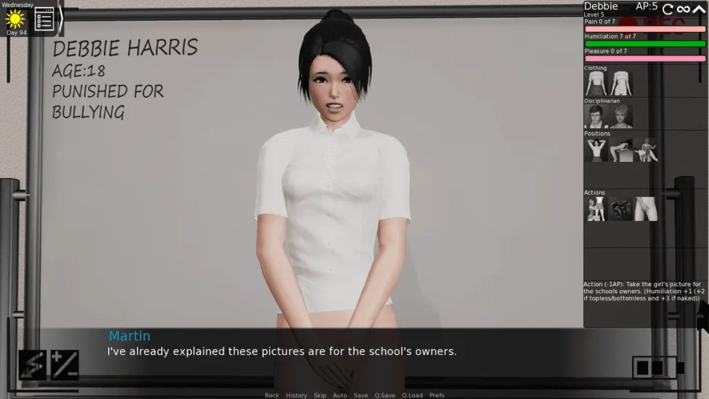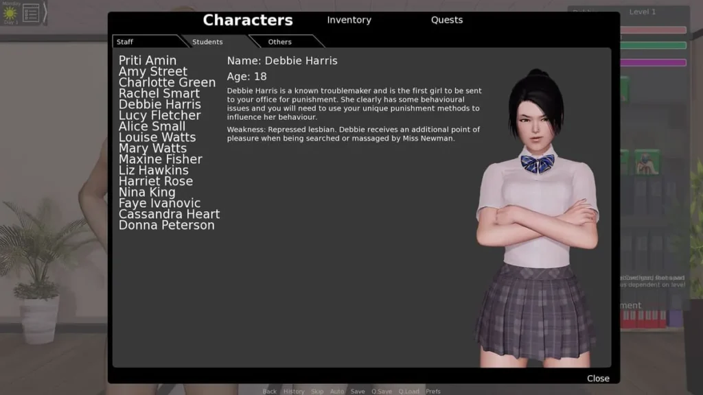 Almost immediately, you’ll trigger the first major quest, “A Man’s Work.” This is your practical introduction to the game’s core disciplinary… mechanics. It involves a student, Sally, and a broken window. This quest is non-negotiable and teaches you the foundational action of administering consequences. My biggest The Headmaster tips here? Save your game before you begin this scene. Experiment with the dialogue options. See how different choices affect Sally’s reaction and your Fear/Submission scores. This is your training ground.
